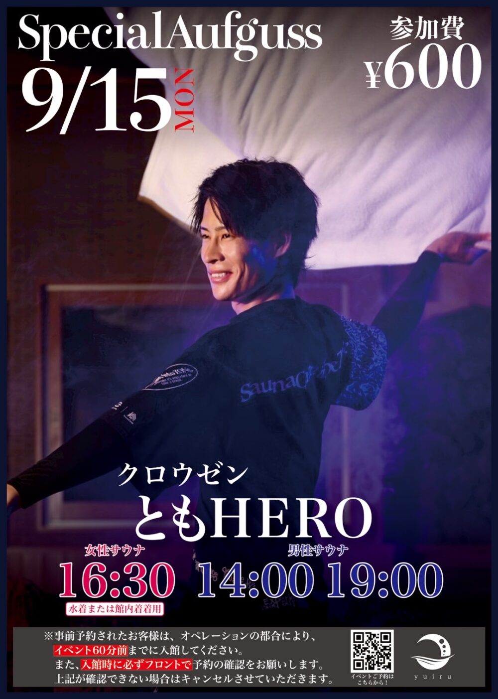 Event スペシャルアウフグース開催 クロウゼン ともHERO 開催日: 2025.9.15(月・祝) 女性: アウフグースサウナ室 16:30 事前予約制 18名 男性: アウフグースサウナ室 14:00/19:00 事前予約制 各18名 参加費: 600円 事前予約されたお客様: オペレーションの都合により、イベント60分前までに入館してください。入館されていない場合は、キャンセルとさせていただきます。 キャンペーン 予約 求人案内