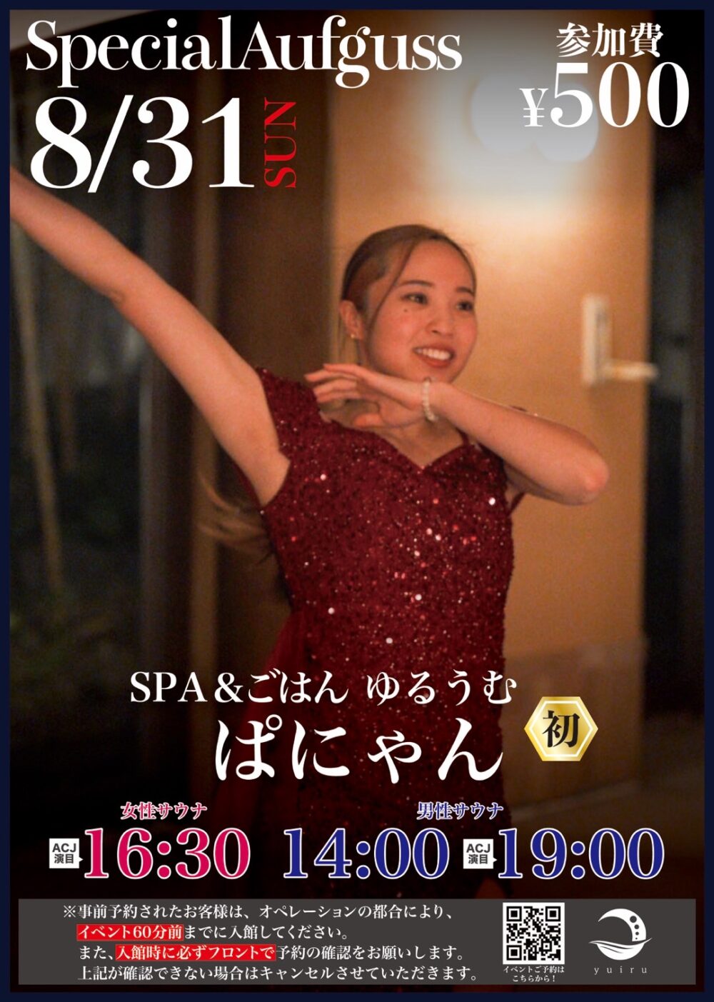 Event スペシャルアウフグース開催 SPA&ごはん ゆるうむ ぱにゃん 開催日: 2025.8.31(日) 女性: アウフグースサウナ室 16:30 事前予約制 18名 男性: アウフグースサウナ室 14:00/19:00 事前予約制 各18名 参加費: 500円 事前予約されたお客様: オペレーションの都合により、イベント60分前までに入館してください。入館されていない場合は、キャンセルとさせていただきます。 キャンペーン 予約 求人案内