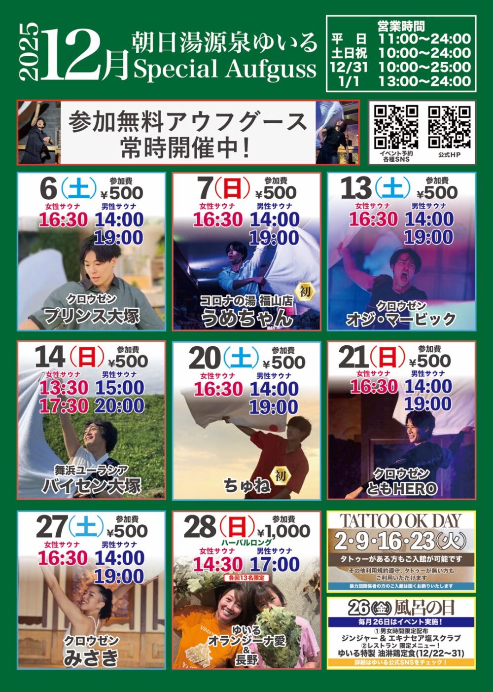 Event EVENT SCHEDULE ゆいる12月のアウフグースイベント イベントの予約はこちらから 事前予約されたお客様: オペレーションの都合により、イベント60分前までに入館してください。入館されていない場合は、キャンセルとさせていただきます。 キャンペーン 予約 求人案内