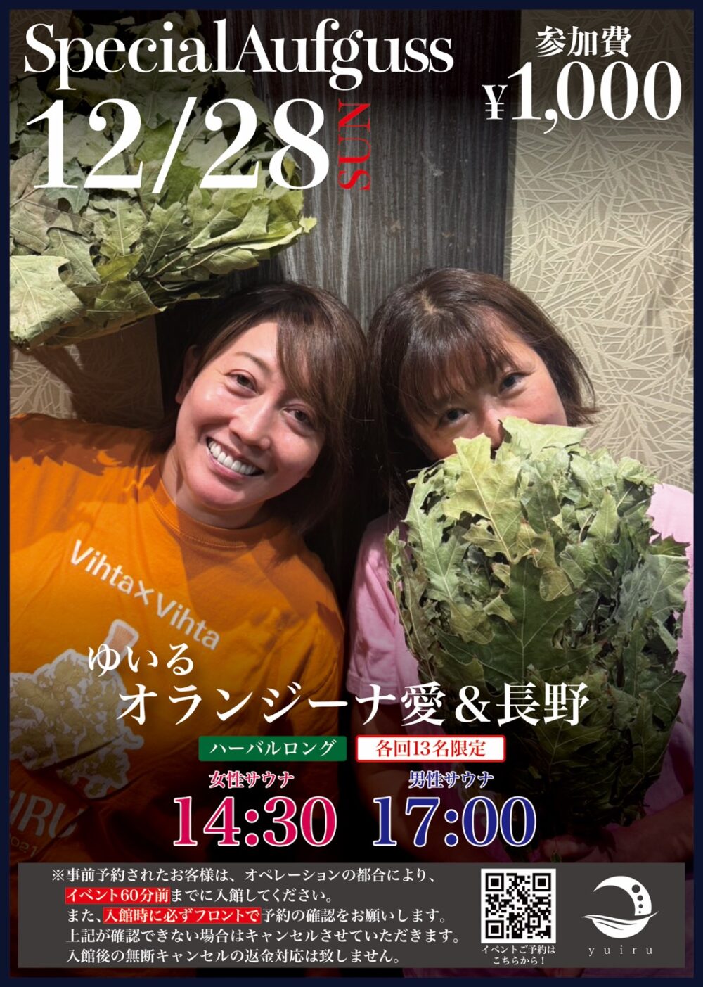 Event スペシャルアウフグース開催 ゆいる オランジーナ愛&長野 開催日: 2025.12.28(日) 女性: アウフグースサウナ室 15:30 事前予約制 13名 男性: アウフグースサウナ室 17:00 事前予約制 13名 参加費: 1000円 事前予約されたお客様: オペレーションの都合により、イベント60分前までに入館してください。入館されていない場合は、キャンセルとさせていただきます。 キャンペーン 予約 求人案内
