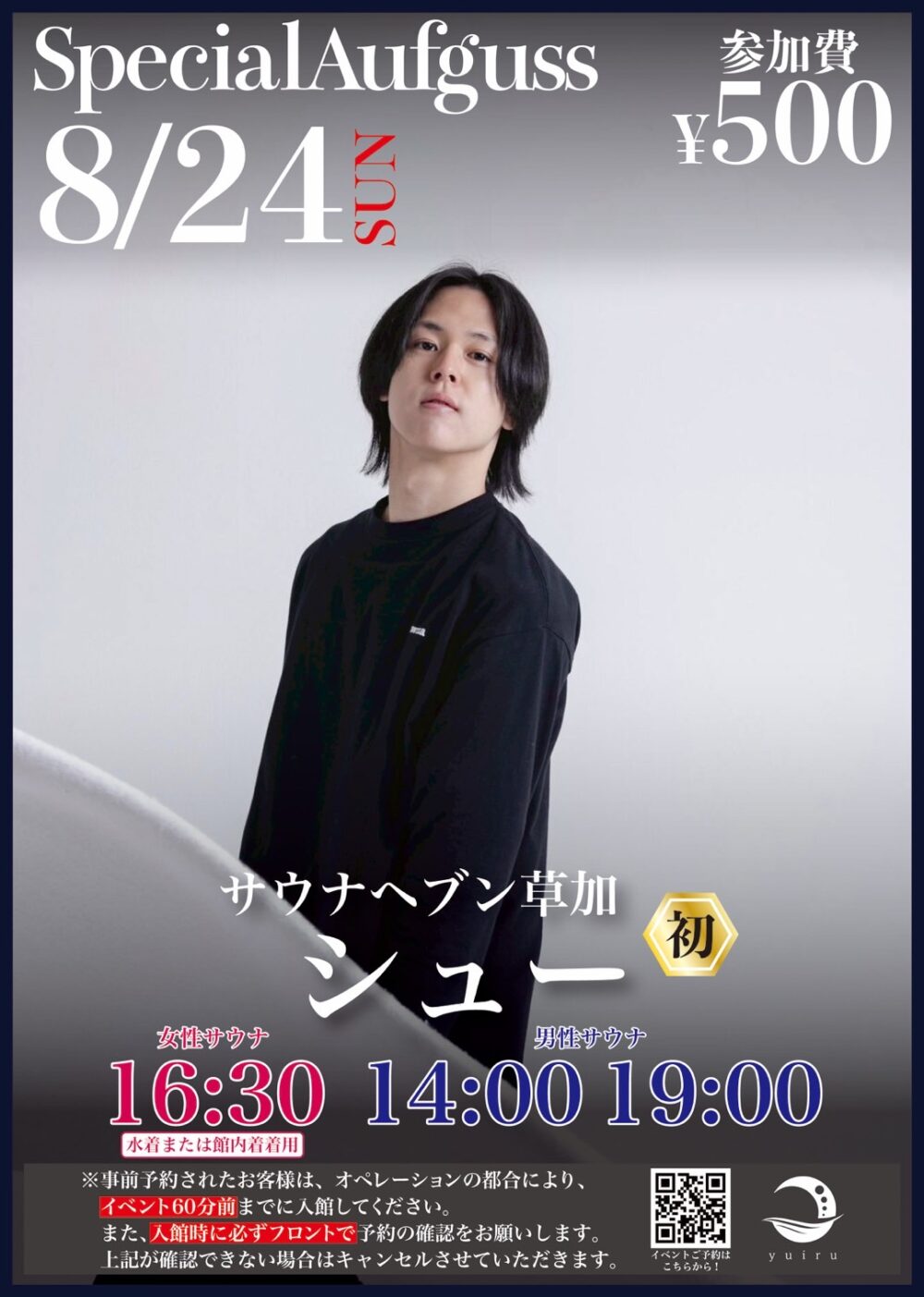 Event スペシャルアウフグース開催 サウナヘブン草加 シュー 開催日: 2025.8.24(日) 女性: アウフグースサウナ室 16:30 事前予約制 18名 男性: アウフグースサウナ室 14:00/19:00 事前予約制 各18名 参加費: 500円 事前予約されたお客様: オペレーションの都合により、イベント60分前までに入館してください。入館されていない場合は、キャンセルとさせていただきます。 キャンペーン 予約 求人案内