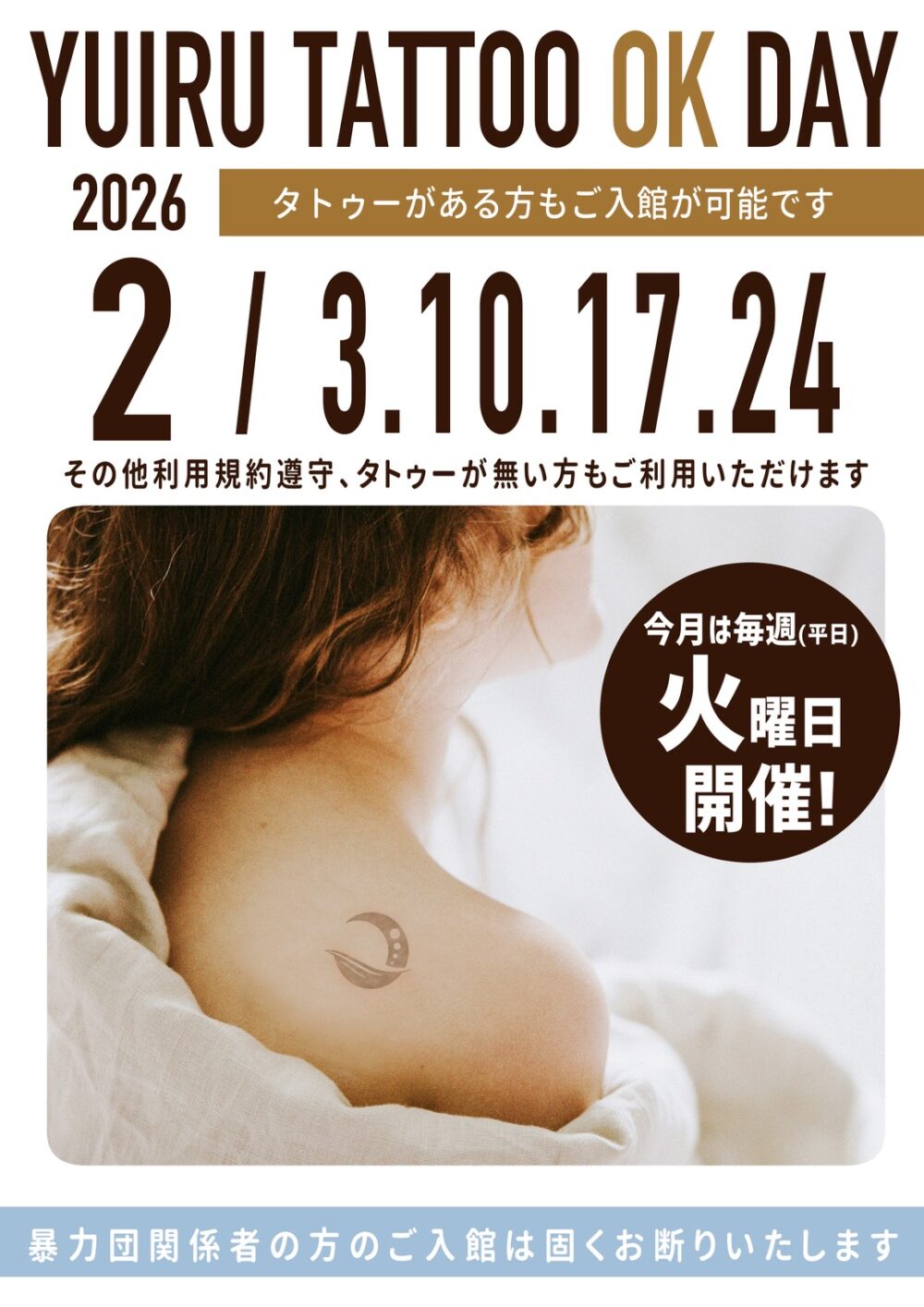 Event EVENT SCHEDULE 2/3.10.17.24(平日火曜日開催)特別企画 YUIRU TATTOO OK DAY タトゥーがある方もご入館が可能ですその他利用規約遵守、タトゥーがない方もご利用いただけます。 事前予約されたお客様: オペレーションの都合により、イベント60分前までに入館してください。入館されていない場合は、キャンセルとさせていただきます。 キャンペーン 予約 求人案内