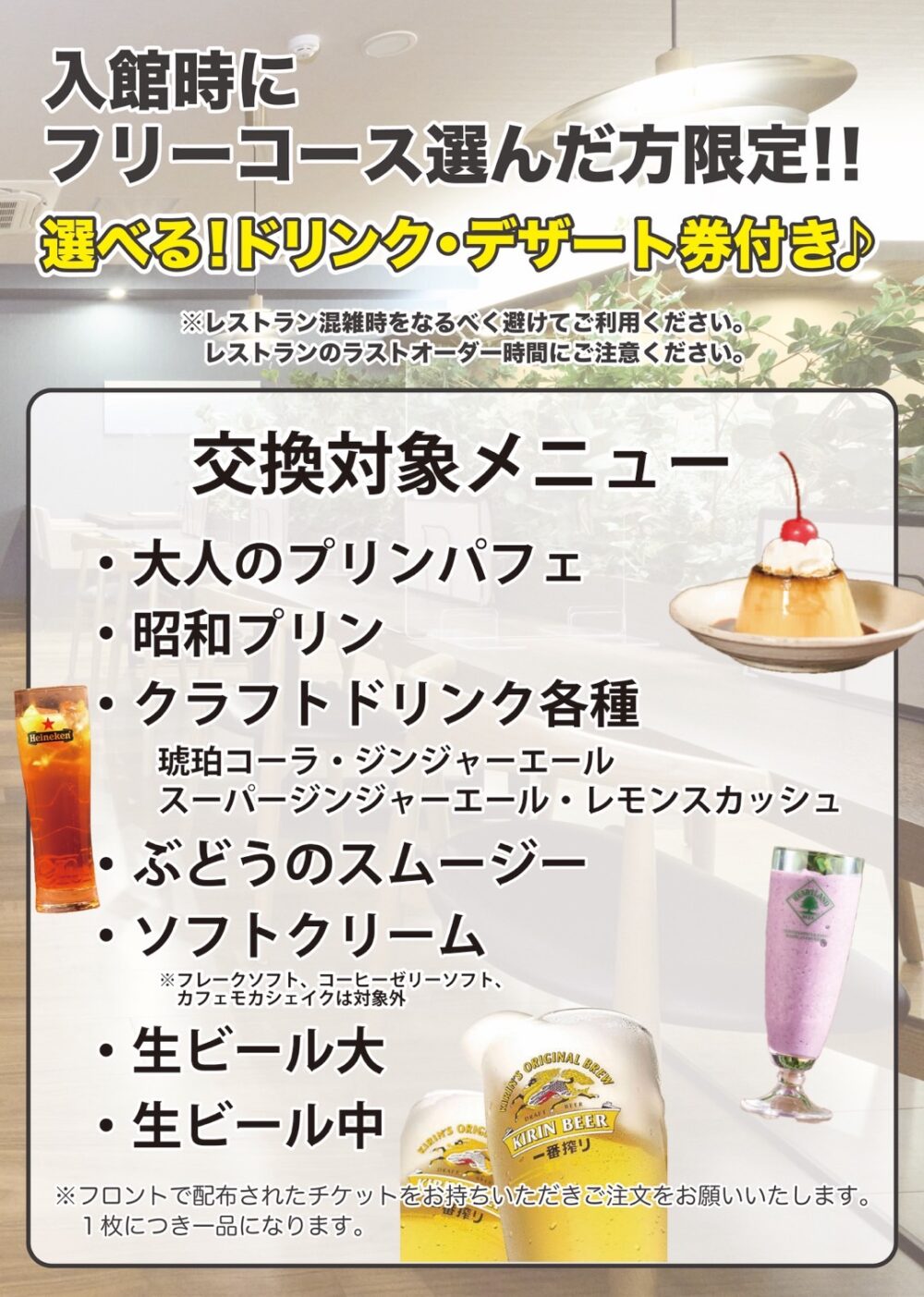 FREEコースでご入館のお客様へレストランで使える、選べるドリンク、デザートチケットプレゼント!! とてもお得な機会です!ぜひご利用下さい。