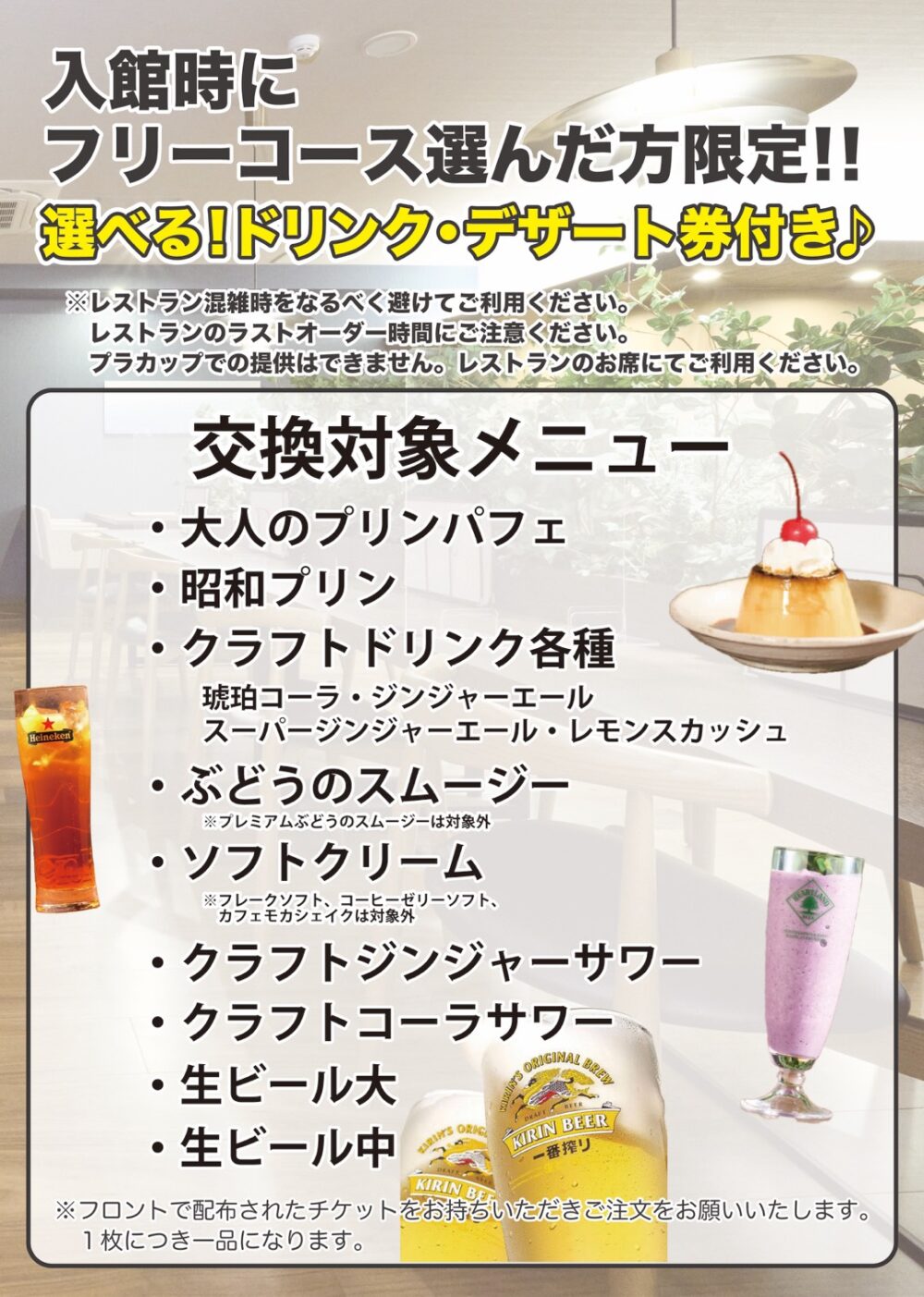 FREEコースでご入館のお客様へレストランで使える、選べるドリンク、デザートチケットプレゼント!! とてもお得な機会です!ぜひご利用下さい。